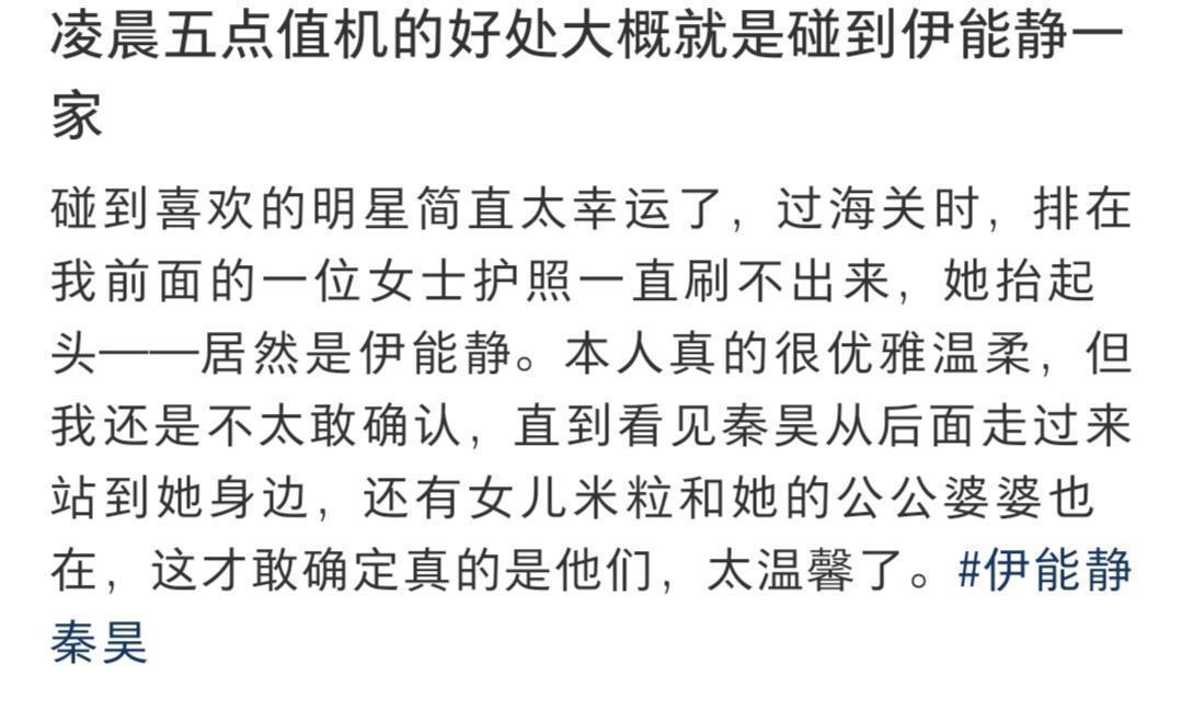 今天(12月19日)凌晨,有网友在机场偶遇了伊能静、秦昊一家。据网友讲述,当时伊能静正在排队过海关,护照一时刷不出来,她一抬头,网友才认出这位举止优雅、态度温柔的女士正是她本人。随后,秦昊很自然地走到她身旁,女儿小米粒和秦昊的父母也在队伍中,一家子齐齐整整,场面很是温馨。